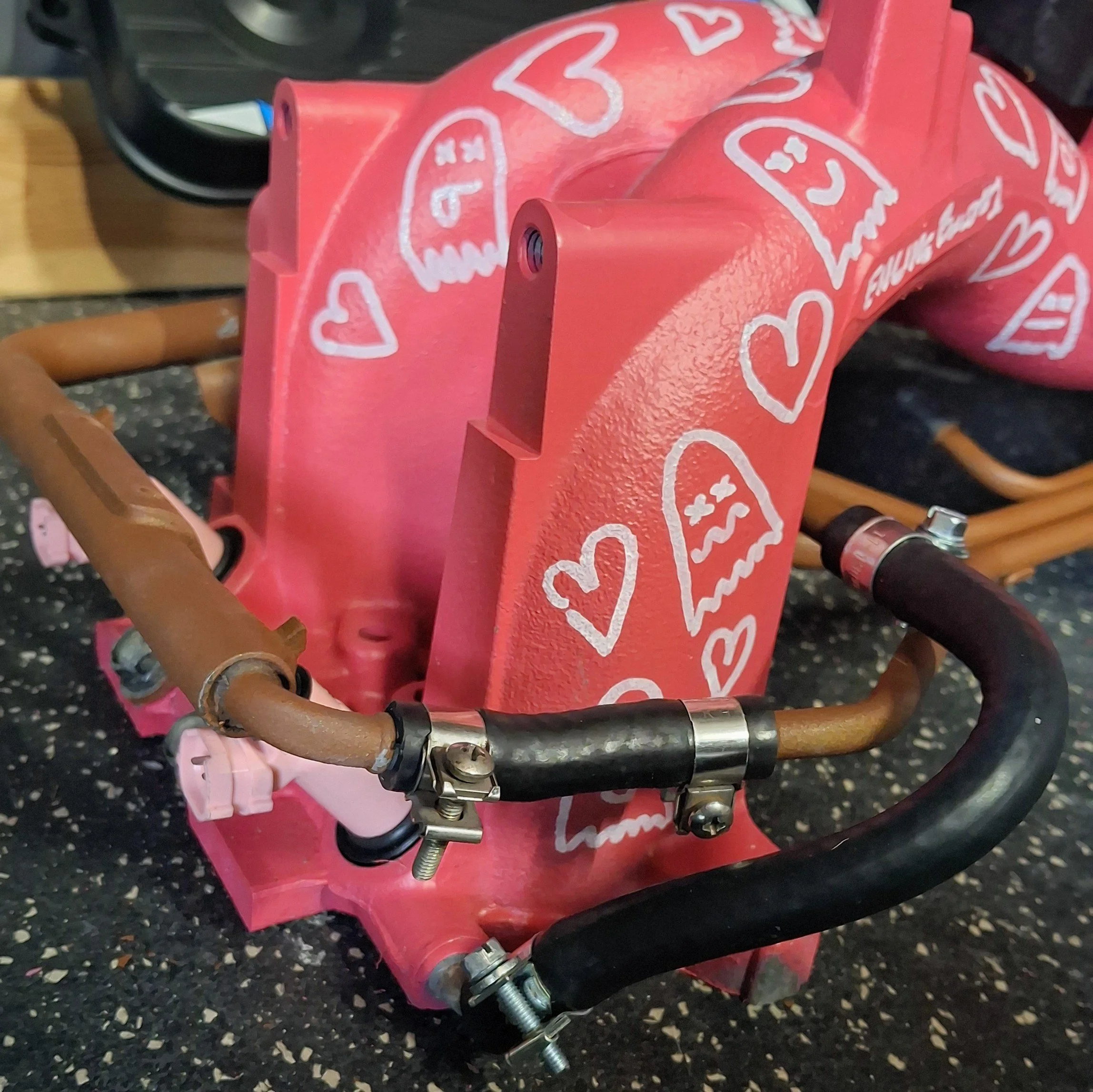 The manifold as a whole system was subject to a lot of neglect. I spent days cleaning, deoxidizing, prepping. With the new build being higher compression, it shifted my vision from pump gas to E-85. High compression early torque, be in the curve when the rest of the class is working towards boost. I had to go Cherry Blossom Red, with a wild livery. Fresh rubber lines, deep cleaned then painted the rails in faux rust paint. I mean it is my signature. Also did a lot of research figuring out how to work STi Pink injectors into the stock system. This will allow E85 to fuel the build. Oh this car is going to be fun.